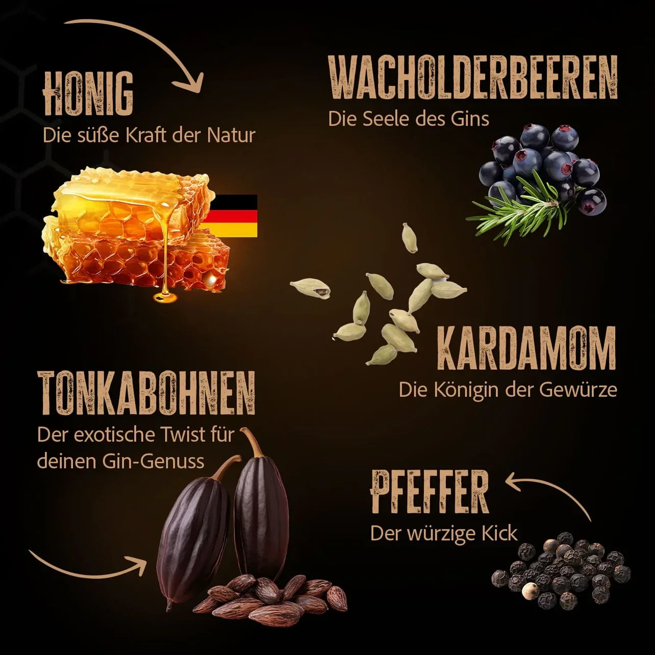 Handverlesene Botanicals wie Wacholder, Tonkabohne, Kardamom, Pfeffer, Koriander, Zimt und Zitrusnoten verleihen unserem Beekeeper’s Revenge Gin seinen einzigartigen, vollmundigen Geschmack –100 % echte Botanicals, keine Zusätze.